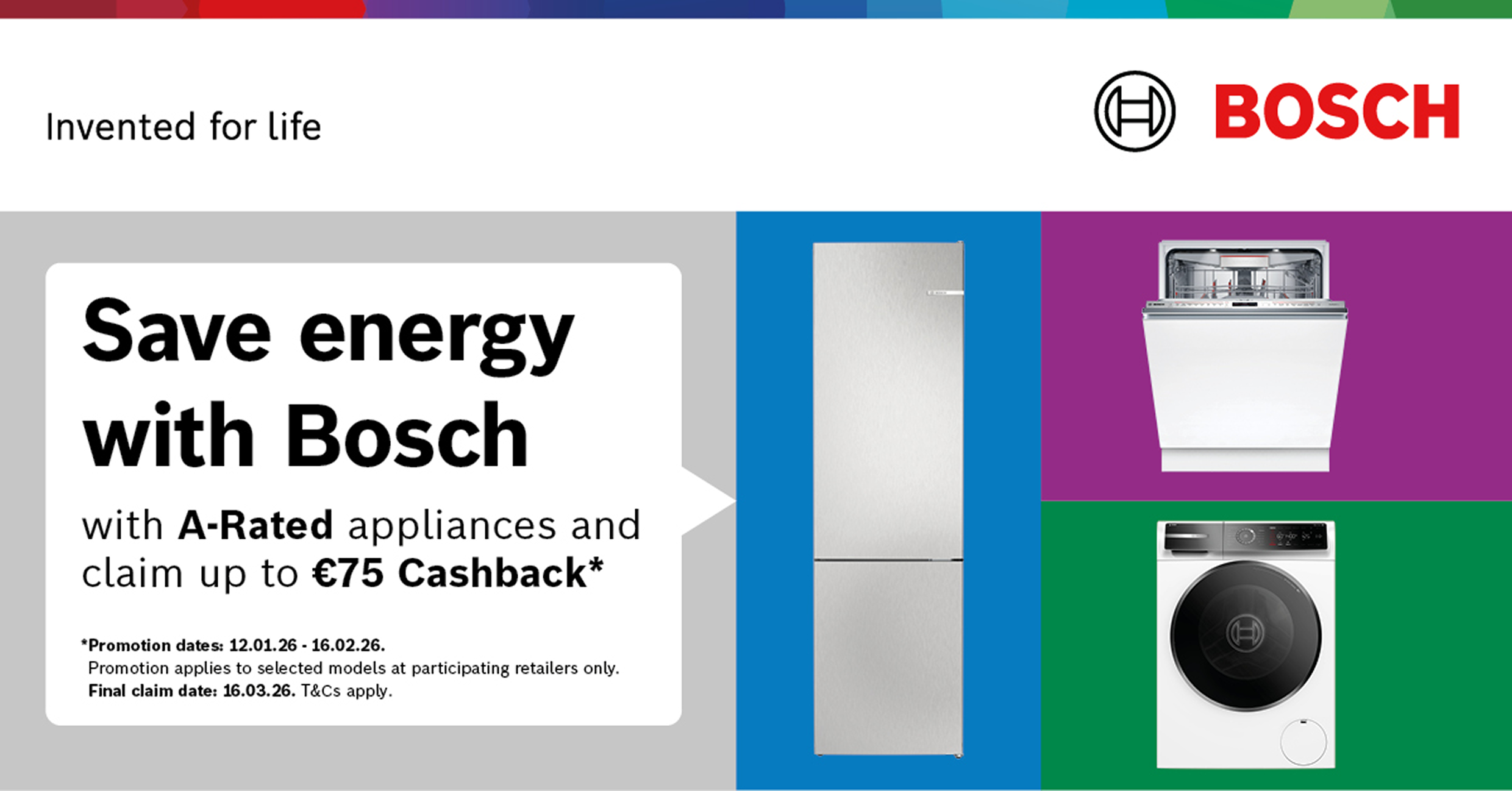 - The Promotion is the offer by the Promoter of up to €75 cashback (“the Gift”) to purchasers when they purchase selected A Rated Bosch appliance. All selected models in the promotion are listed below with the corresponding cashback value.